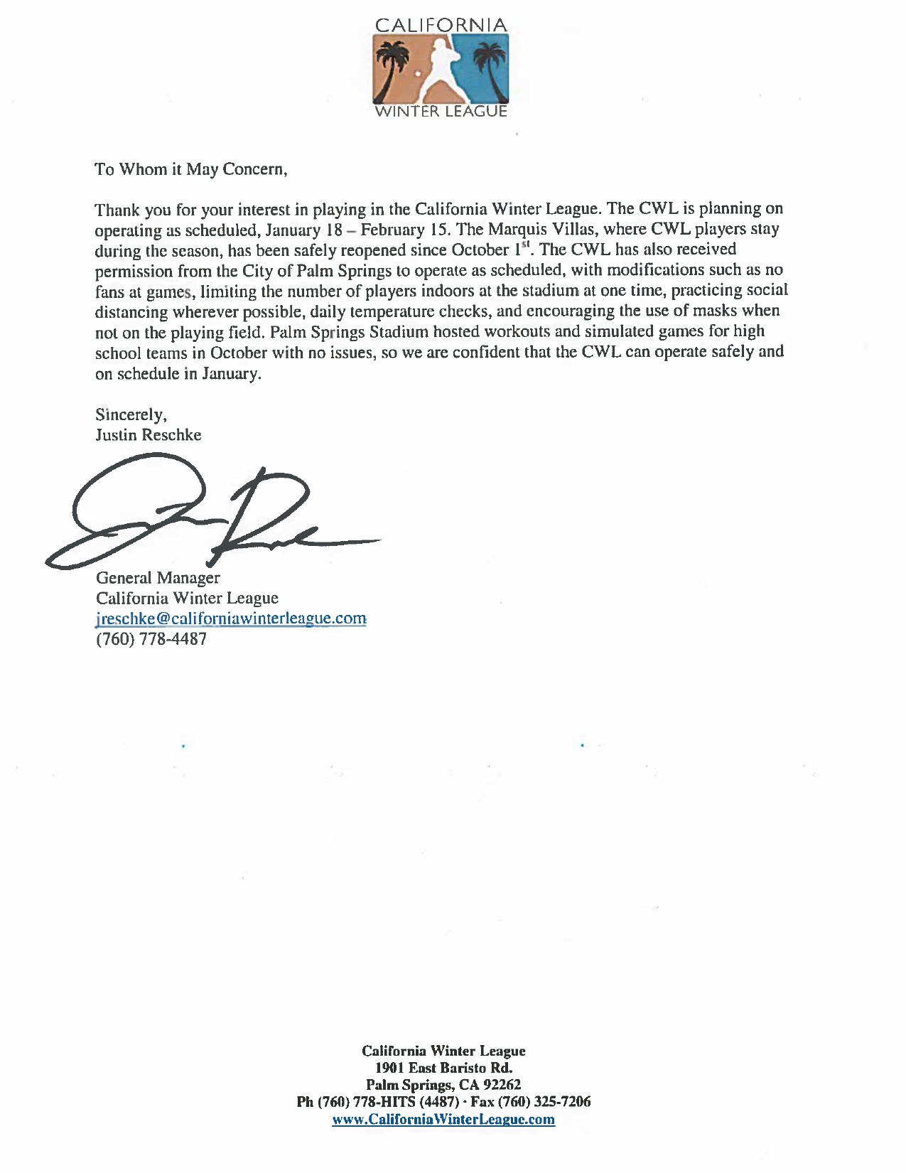 全米最大規模のトライアウトリーグであるカリフォルニア・ウィンターリーグ(以後CWL)参加に興味を持って下さり、どうもありがとうございます。2021年度のCWLは来年1月18日〜2月15日の開催となっています。例年通りのリーグ期間中の滞在先であるマーキーヴィラスリゾートは10月より平常通りの営業を再開しています。また、CWLはパームスプリングス市から正式にリーグをスケジュール通りに開催する許可を得たことをここにお知らせいたします。許可をいただくまでに昨年の10月から様々な協議や試行錯誤を重ねた結果として開催の許可をいただきました。(メイン球場の隣のサブグランドである高校のグランドにてリーグを開催するための想定運営を行なってきました)
