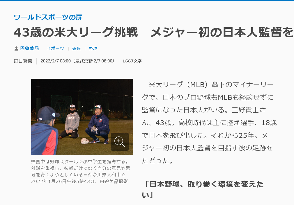 弊社代表であり、MLBミネソタ・ツインズ傘下1Aのヘッドコーチを務める三好貴士の記事が「毎日新聞」さんにおいて掲載されました。