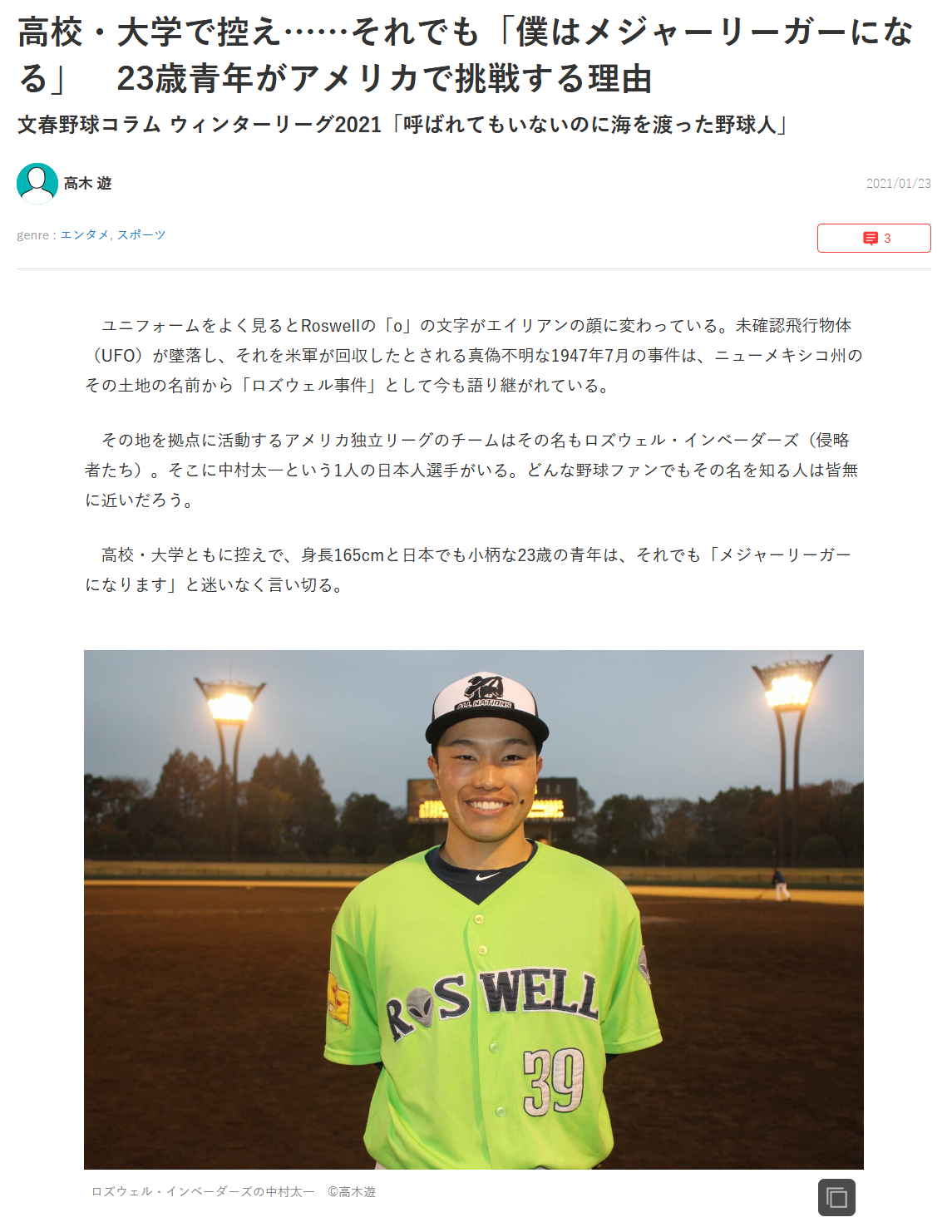 現在、カリフォルニア・ウィンターリーグに参加中の弊社クライアントの中村太一選手が「文春オンライン」さんにおいて掲載されました。こちらも前回に引き続き、スポーツライターの高木遊さんが書いて下さっています。