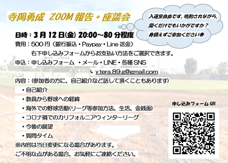 Zoomを用いての開催となります。詳しくは以下のフライヤー、また寺岡選手のFBページや各種SNSからもご確認くださいませ。