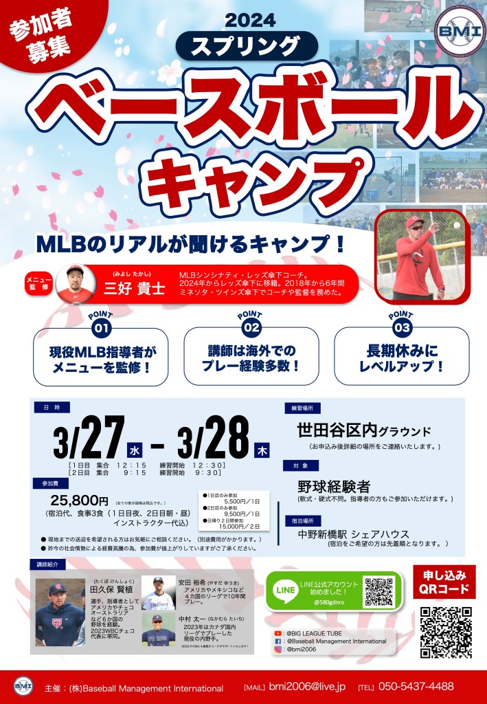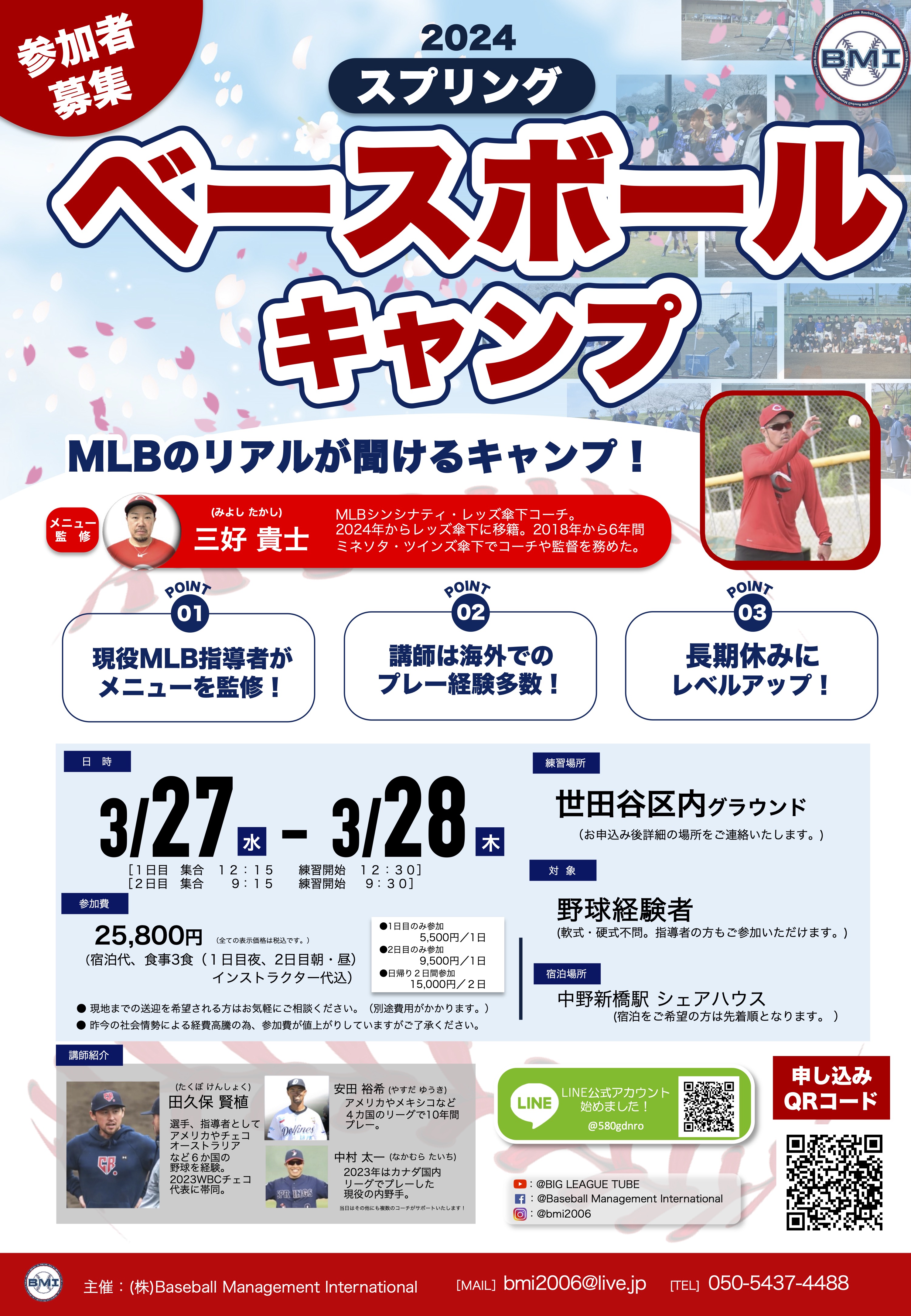 MLBシンシナティ・レッズ傘下マイナーリーグのコーチを現役で務めながら、弊社代表である三好貴士がプログラムを監修するこのキャンプでは様々な練習ドリルはもちろん、競争の激しい環境下でも勝ち抜けるメンタリティーを伝えていきます。