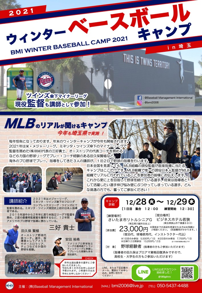 MLBミネソタ・ツインズ傘下マイナーリーグのベンチコーチを務めながら、弊社代表である三好貴士がプログラムを監修するこのキャンプでは様々な練習ドリルはもちろん、競争の激しい環境下でも勝ち抜けるメンタリティーを伝えていきます。